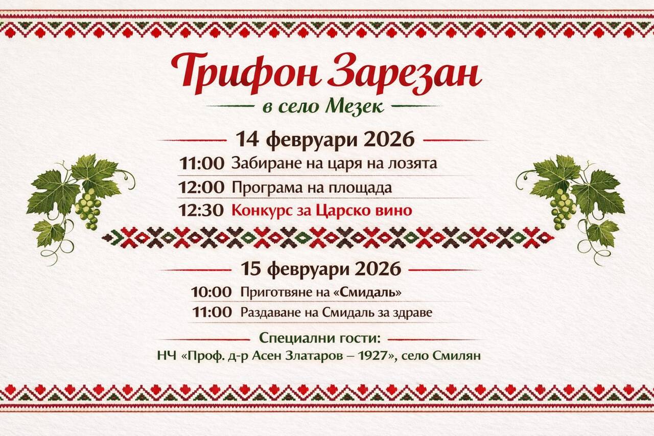 Зимният празник Трифон Зарезан в село Мезек ще се проведе на 14 февруари 2026 г.