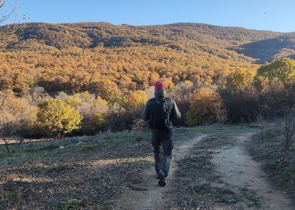 Следва фургона, който ви се пада вляво. След него хващате наляво, тук-там има маркировка по дървета и храсти, но трябва да я търсите, не се вижда добре. Добре се вижда обаче билото на Сакар пред вас.